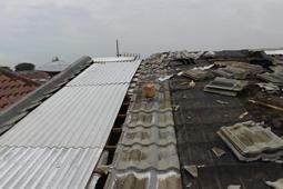 mengganti atap genteng beton dengan atap asbes gelombang,ketika sebuah atap dalam kemiringannya kurang,maka akan cenderung bocor/tampias di musim penghujan,salah satu owner memutuskan untuk mengganti atap genteng beton dengan asbes gelombang dengan memakai kontruksi kuda-kuda atap baja ringan yang lama(tidak diganti).